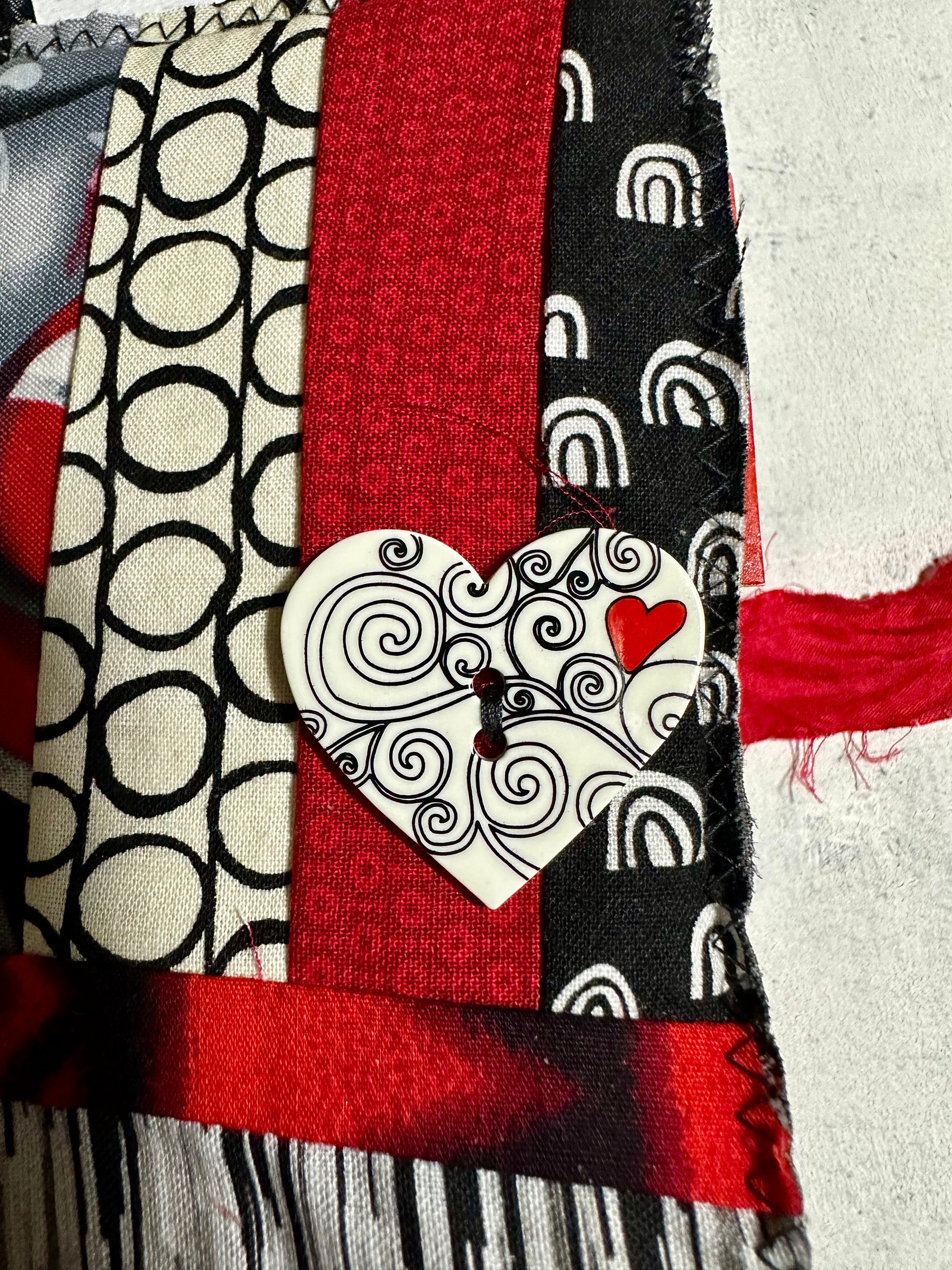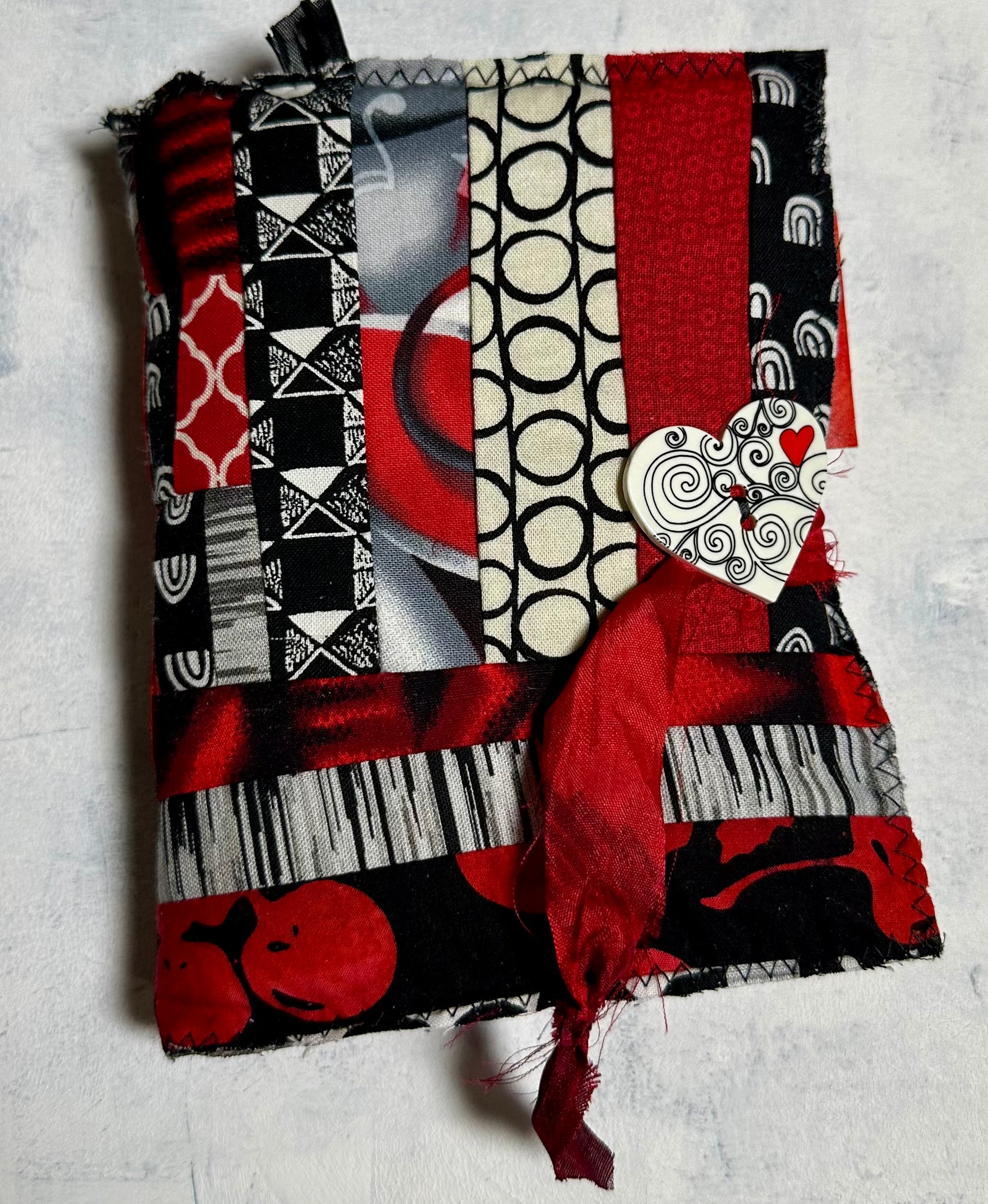 This journal has 156 pages, a quilted cover, and a cute button closure. A unique piece, perfect as an art journal, memory book, or junk journal. Perfect size for journaling on the go.