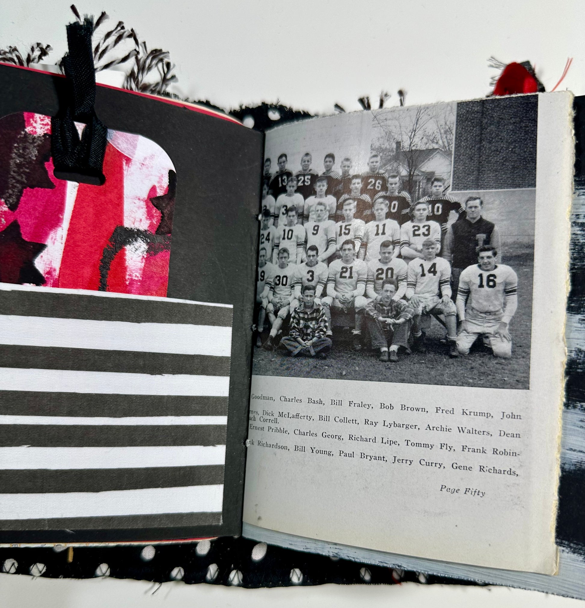 Immerse yourself in creativity with this one-of-a-kind handmade art journal. Featuring a stunning quilted cover and a curated selection of painted pages, vintage ledger paper, music sheets, maps, and yearbook pages, this journal is perfect for art journaling, sketching, and memory keeping. Its travel-friendly size makes it the perfect companion for on-the-go inspiration.