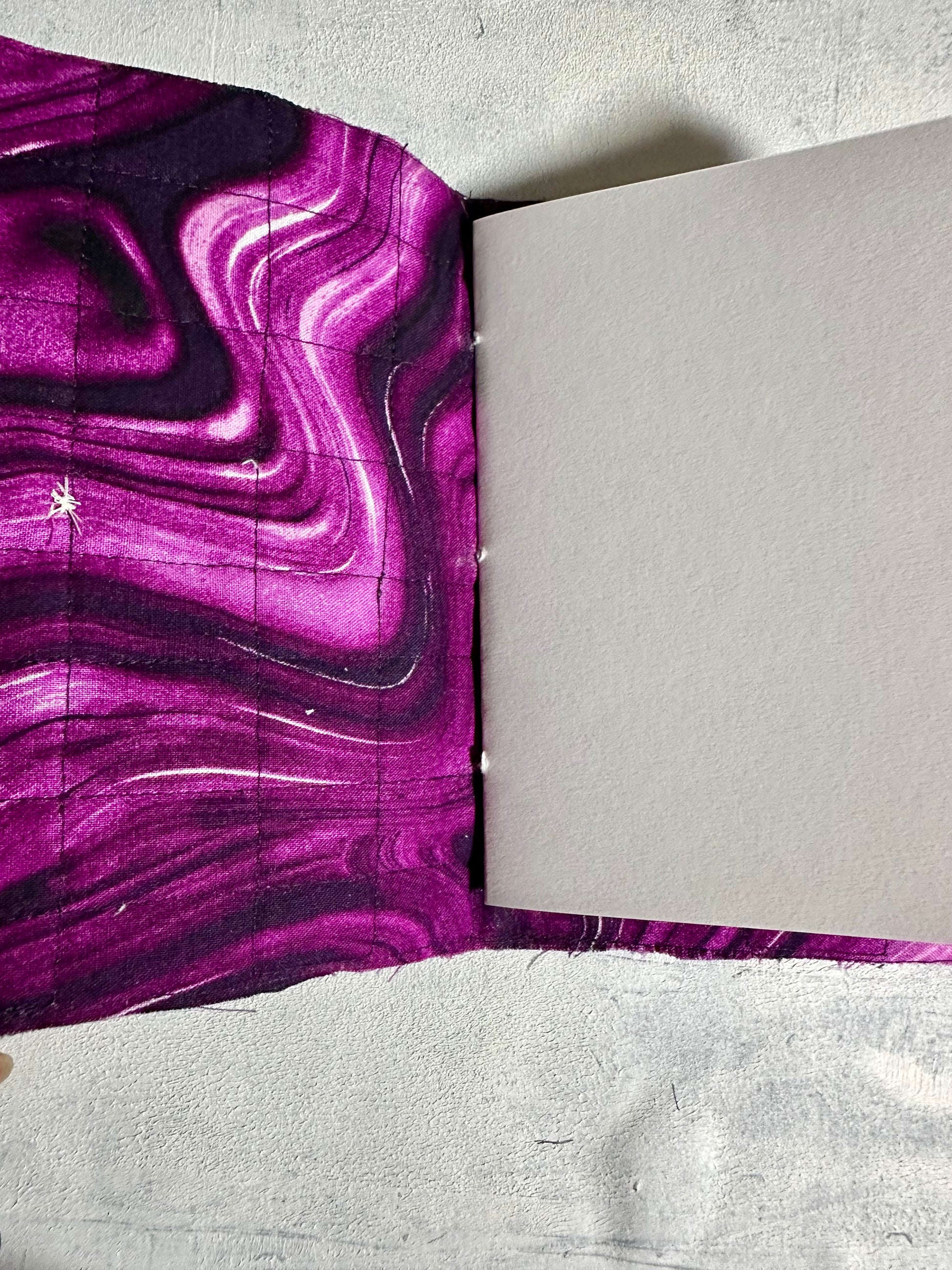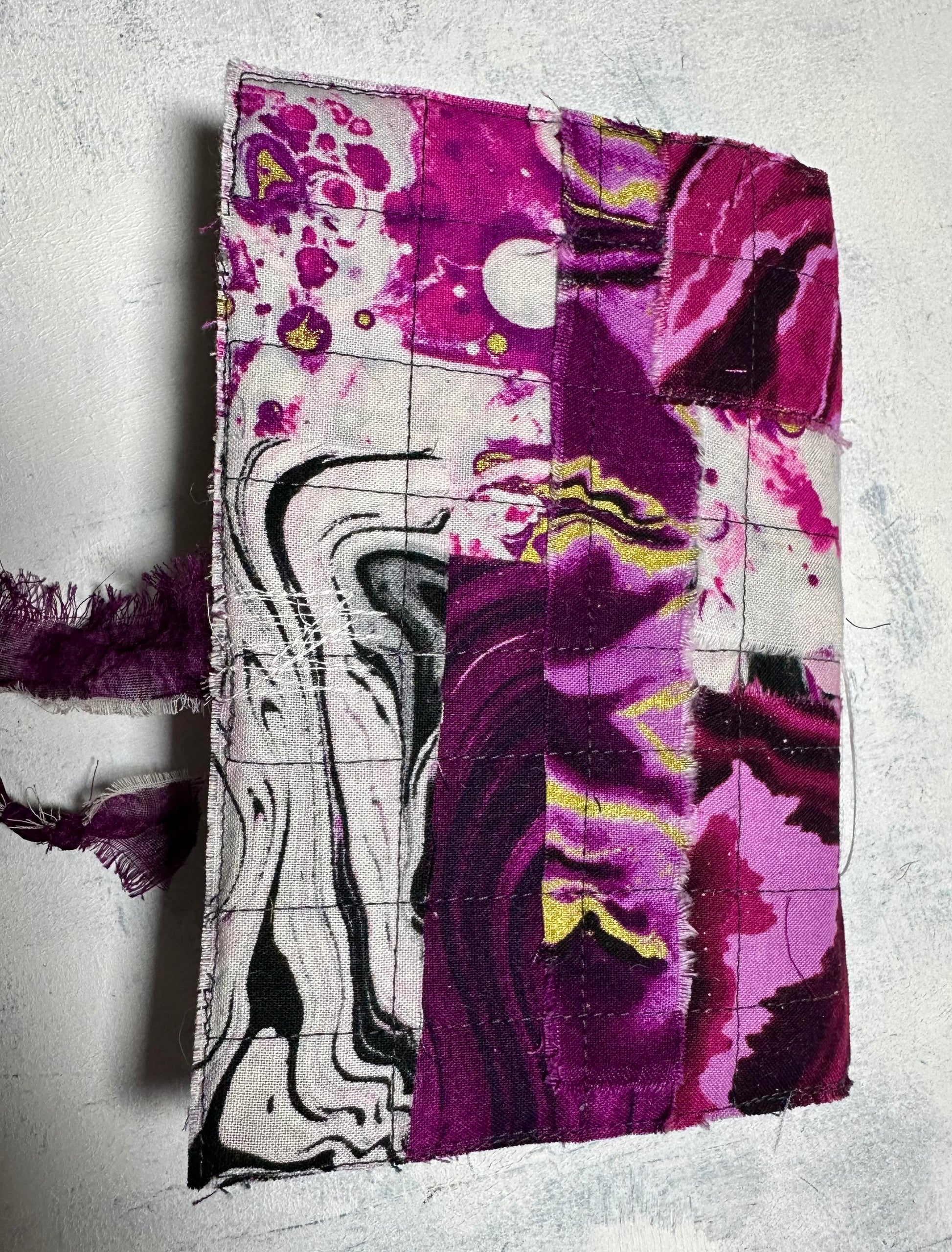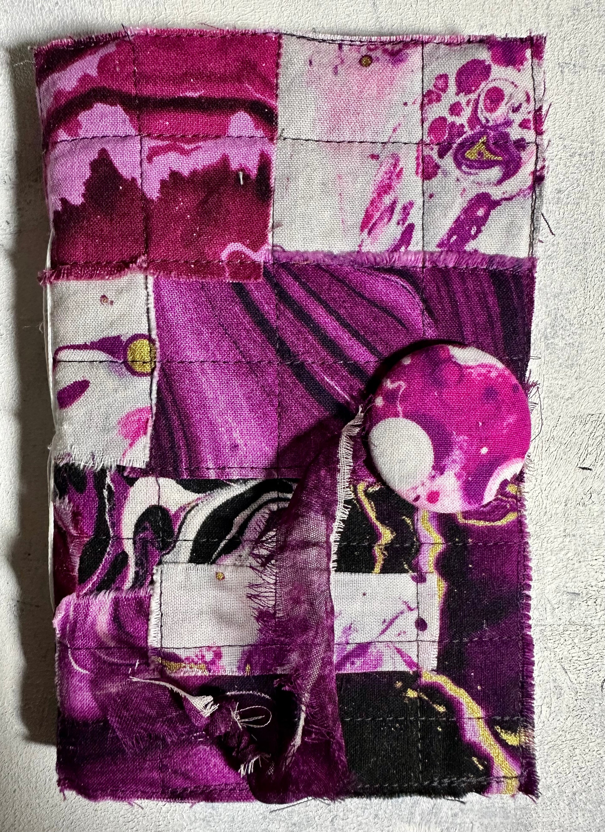 Purple Collaged and Quilted Cover with interesting shapes and textures. Large covered button closure with purple sari scrap. Has plenty of room to grow to a chunky journal. Perfect as an art journal, memory book, or junk journal. Great portable size for journaling and sketching on the go.