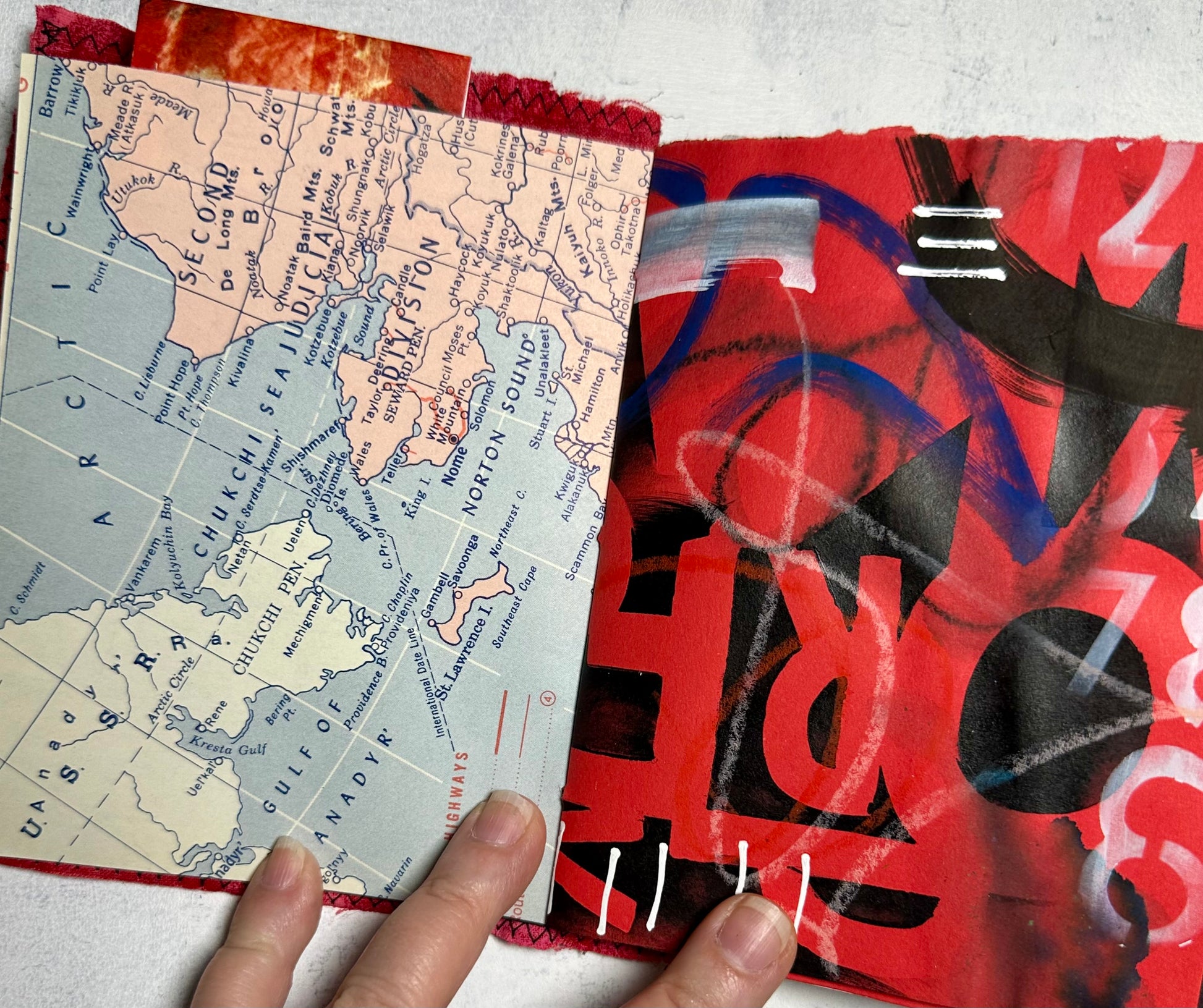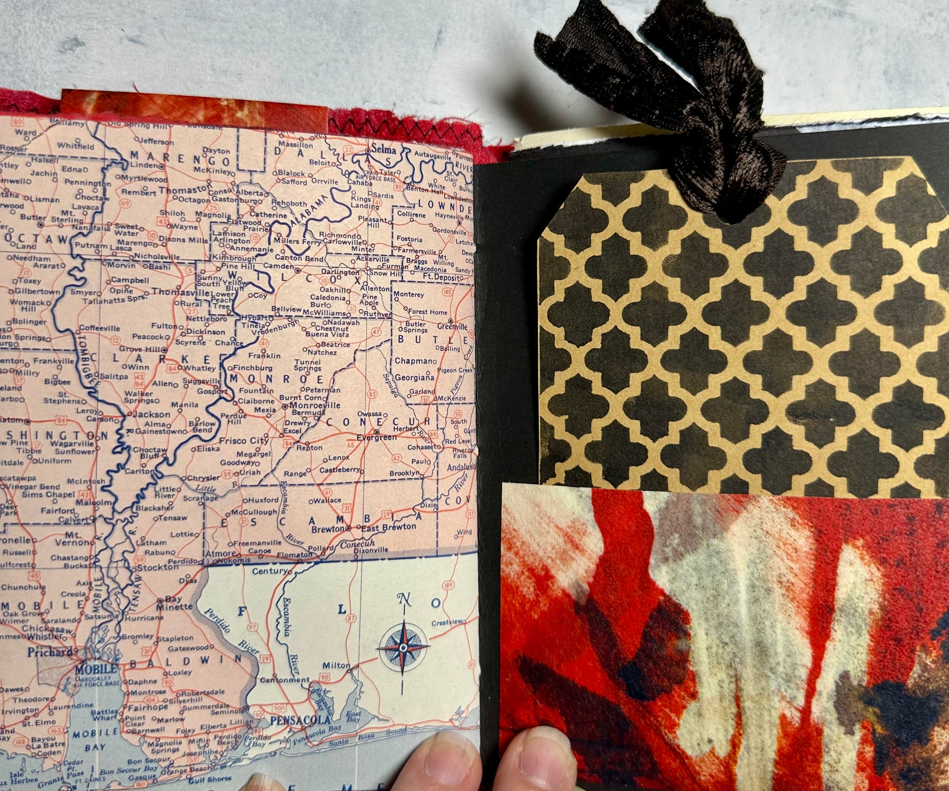 Papers used: Vintage ledger, map, yearbook, & book pages, painted papers, pockets, tags & tabs.